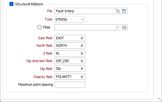 The Structural Ribbons options, including the Polarity field, have been added to the Input Points tab of the Intrusion Lithology Modelling form on вкладке Условное, в группе Литология.