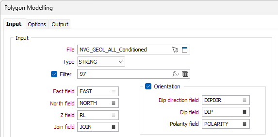 Orientation options have been added to the Input tab of the Polygon Modelling form to support specifying the Dip Direction, Dip and Polarity fields for the polygon input.