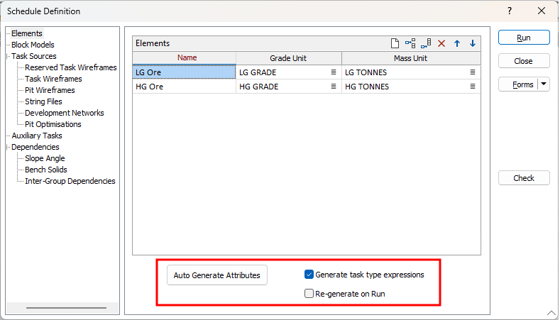 On the Elements tab of the Schedule Definition form, you can now click an Auto Generate Attributes button to auto-generate attributes whenever an attribute re-build is required. Individual task-types can then be edited to turn off any attributes that aren’t needed.