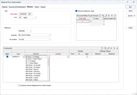 Не может использоваться с количествами, которые используют бины материала, количества рудных складов, именованные количества или количества, сформированные из нескольких терминов.