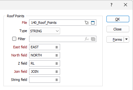 Выберите тип файла и двойным нажатием левой кнопки мыши (F3) укажите файл, содержащий точки кровли. You can also click the Pick from Vizex button to collapse the form and interactively select a layer containing the file to be inserted and return to the form.