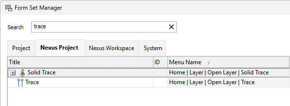 The Search string is applied across all of the available tabs of the Form Set Manager, so that any matching entries in other tabs are also displayed: