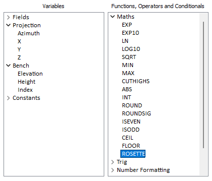 Support for variable face angle constraints based on rosette within a wireframe has been added to Pit Design (Dynamic) with the introduction of the ROSETTE Maths function to Редактор выражений. Additionally, the contextually available Projection and Bench variables have been added for all constraint types: