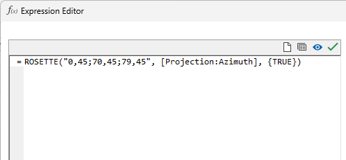 The Rosette function (rosette,azimuth[,clampSlope]) enables the interpolation of a value for a specific azimuth from a rosette of azimuth/value pairs. The rosette is defined by a string of azimuth and value pairs (azimuth1,value1; azimuth2,value2 etc). If the clampSlope parameter is set TRUE, the interpolated value is 'clamped' so the projection will not extend beyond the tangents of the rosette values. If the expression cannot be evaluated, a BLANK value is returned.