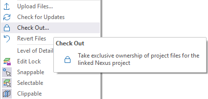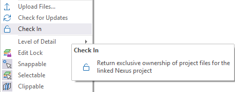 Support for taking and returning exclusive ownership of project files in the linked Nexus project using the Check Out / Check In feature has been added to the Vizex Layer Display context menu.