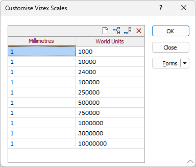 Если выбрать параметр Настроить в меню Задать масштаб, откроется форма Настроить масштабы Визекса.