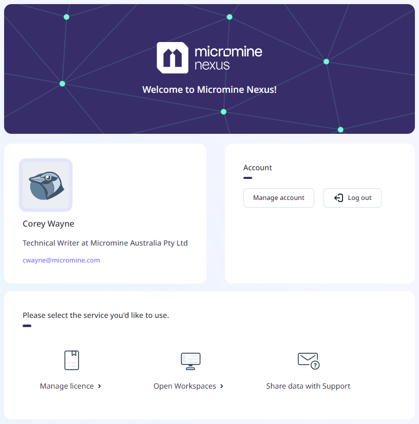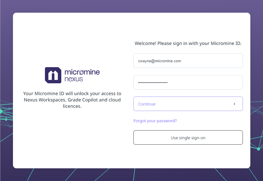 A Micromine ID is a convenient single account for accessing all services on the Micromine Nexus platform. Your Micromine ID will be created for you from your email and a password when you set up a cloud licence or any feature which requires the cloud and an ID, such as Nexus Workspace. If you would like to use any of the cloud-enabled features and you have not been assigned a Micromine ID, contact Support at support@micromine.com to get started.