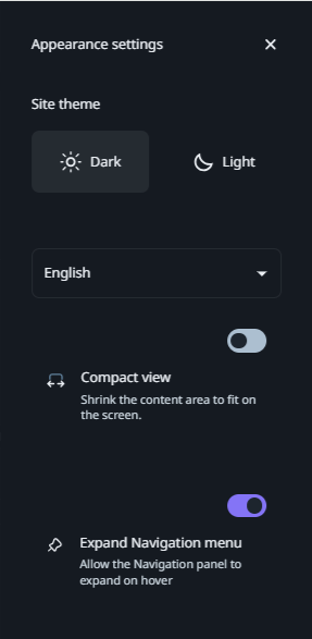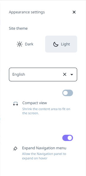 The default Site theme is Light, or you can set the appearance to Dark by clicking the option: