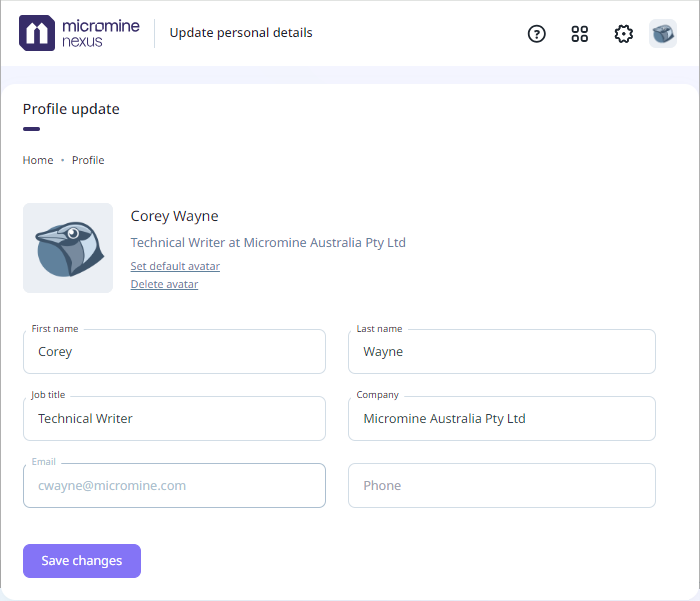 If you click the Manage Account button, the Profile page will open and you can make changes to your details, as described above. This option can also be accessed from any page on Nexus - Home from your Account Name at the top right: