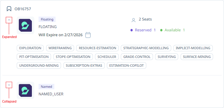 You can collapse or expand the details for each licence listed using the down arrow at the left of the licence product logo: