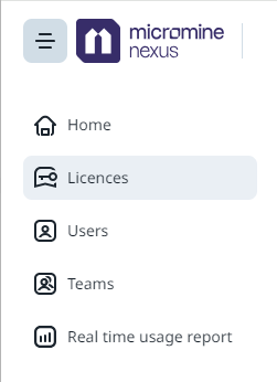 From any of the pages in Nexus - Manage Licence, you can expand the menu at the left using the Menu button next to the logo: