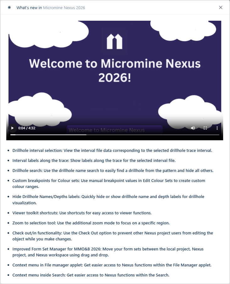 The What's New panel contains a short video outlining the latest features for Nexus:
