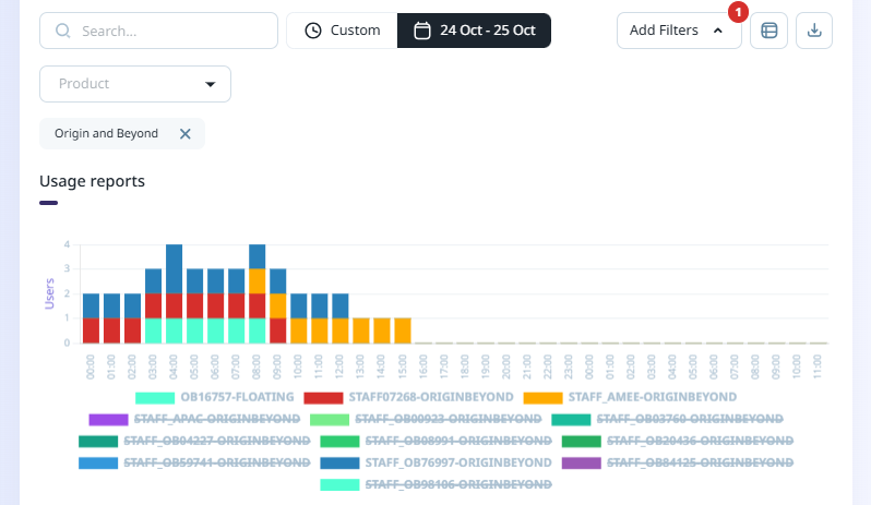 You can further limit the displayed information using the Legend label for each user. For example, if you click on a label to toggle it OFF, it will appear crossed out and the information for that user and licence will not be displayed in the graph. In the following example, all but four of the users have been removed from display: