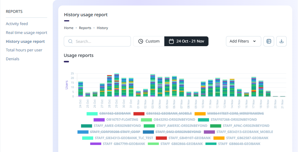 The History Usage Report tab of the Reports page provides information on the historical usage of the licence Seats configured for your Company.