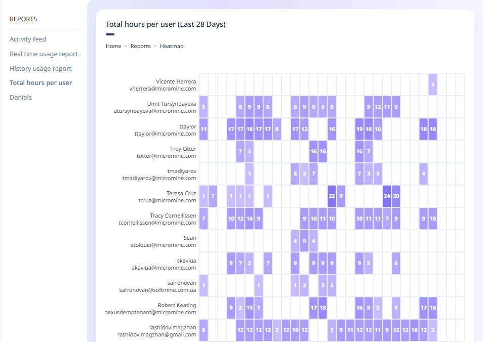 The Total hours per user tab of the Reports page provides a heatmap of the number of usage hours of any licence per user across a period of the last 28 days.