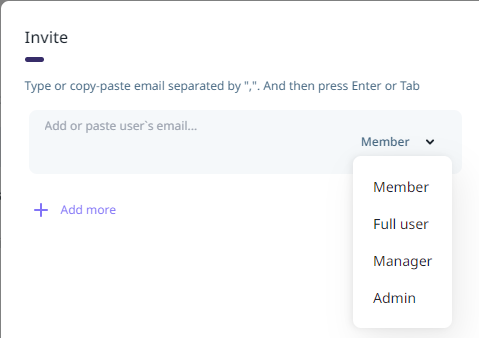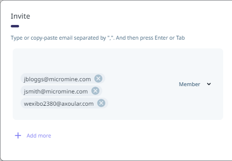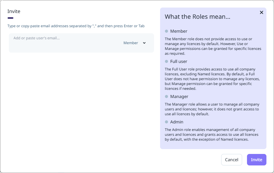 Invited users will be assigned the Member role by default. The role can be modified later by an Administrator when the user is assigned a licence. Alternatively, you can select a role for the invited user from the drop down: