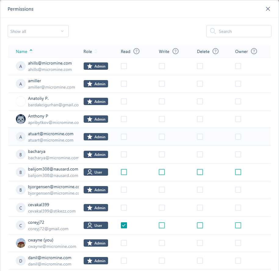 Selecting Permissions from the Other menu will open the Permissions page with the Users on the tenant and their granted permissions for the file: