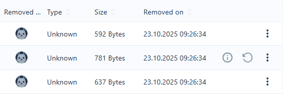 Information on the Name, Type and Size for each object is displayed in the Recycle Bin. The name of the user the file was Removed by and the date it was Removed On are also listed. The Original Paths information for each object links to the location where the object can be found. If a Warning exists for a deleted object, an icon will be displayed, and you can hover on the icon to view the warning: