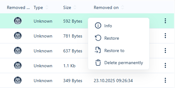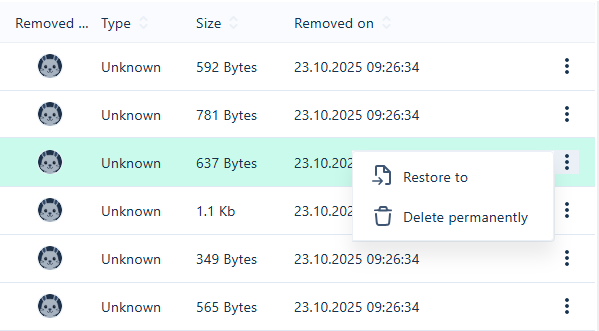 The More menu for each deleted object or task provides options to Restore the file or Delete it permanently: