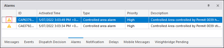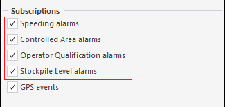 Speeding, Controlled Area, Operator Qualification and Stockpile Level alarms are enabled by default after an installation or an upgrade of the system:
