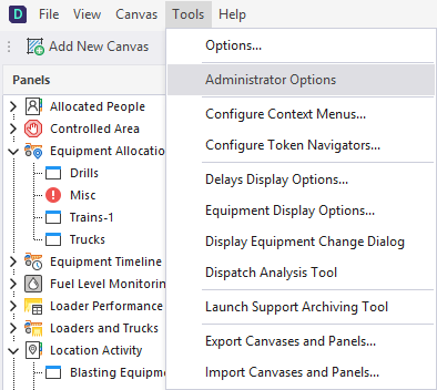| Export/Import Canvas and Panels | Used to Export or Import Canvases and Panels archive files. These options are also available from the Tools menu, unless either Lock Positions and Lock Panel Configuration is enabled in the Administrator Options. |