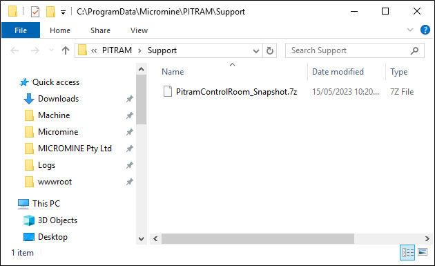 As outlined in the prompt, this archive file can be emailed to Pitram Support (pitramsupport@micromine.com) to assist in resolving any issue for which support is required.