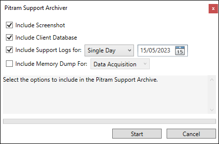 If you select the Include Memory Dump option, you can select the Pitram application for which you want to include a memory dump for the support archive - i.e. Data Acquisition, Event Editor etc.