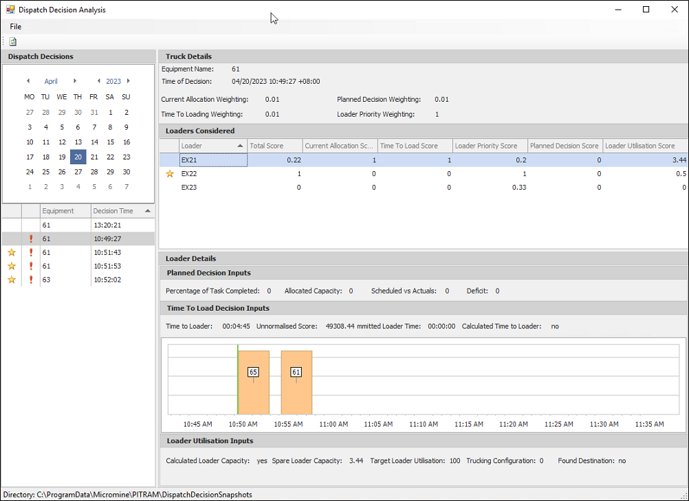The Tools | Dispatch Analysis Tool option opens the Dispatch Decision Analysis tool which displays information on the dispatch decisions for trucks and loaders on a selected date.