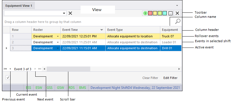 The Event Editor is used to add or edit events in the Pitram database. The Pitram database stores time-stamped events that have occurred throughout the mining operation. When you edit events in the Event Editor, you can choose to view events for a particular day, shift, location, operator, or equipment unit.