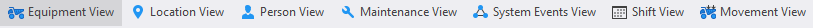 The Event Editor consists of a number of tabbed views and panes, a menu bar, a toolbar, and a status bar. There are six View options (Equipment, Location, Person, Maintenance, System Events and Shift).