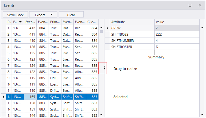 When you select an event in the Events panel at the left, a summary of the event is displayed at the right. You can adjust the width of the columns in the Events pane by dragging the control in the centre scroll bar left to right.