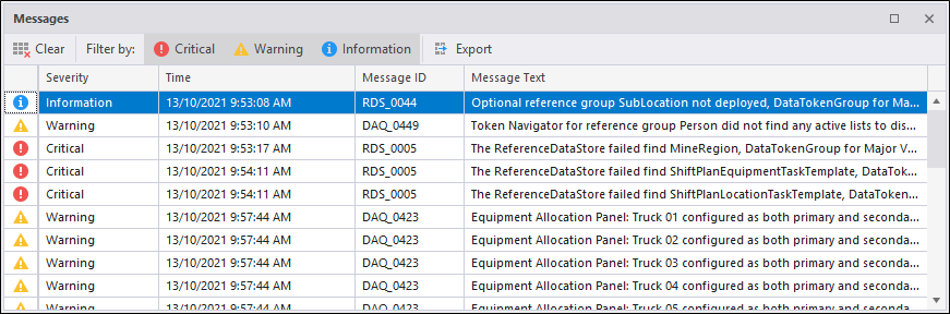 Click this button to export the messages to a log file. When you select this option ALL messages will be written to the log file, irrespective of the filter being used to display them.