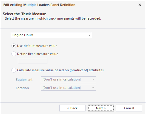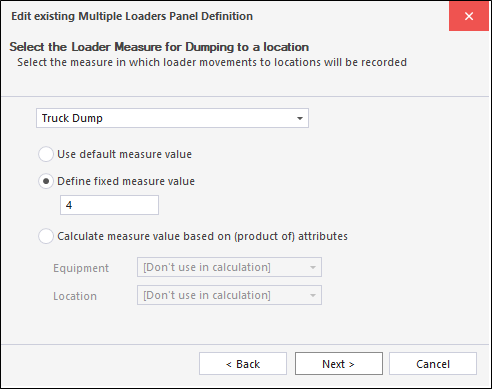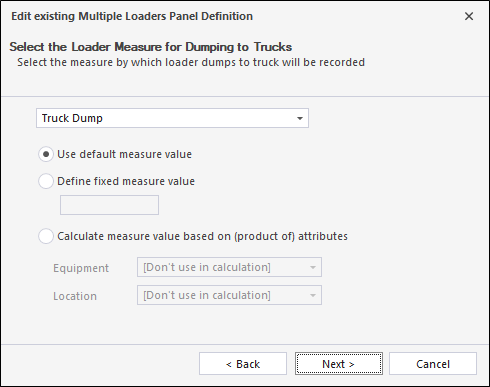 - Click Next and use the Loader Measure... page to configure the measure used to record loader dumps to trucks.