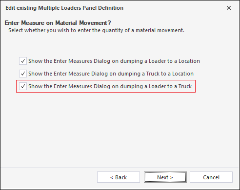 - Click Next and use the Enter Measure on Material Movement page to set options which determine whether or not to display the Enter Measure Dialog when dumping a loader to a truck: