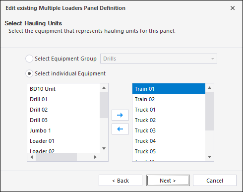 Click Next and use the Select Hauling Units page to configure the Hauling Units for the panel.
