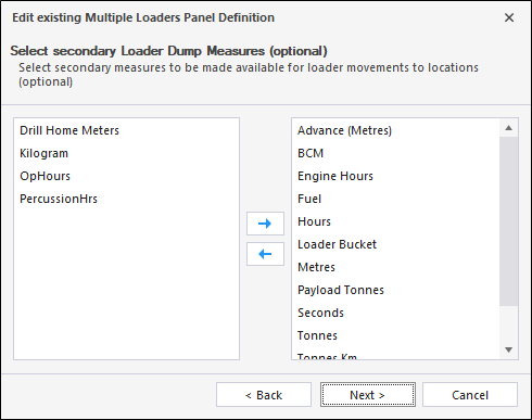 - Click Next and use the Loader Dump Measure... page to select the secondary measure/s to be made available for loader movements.