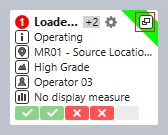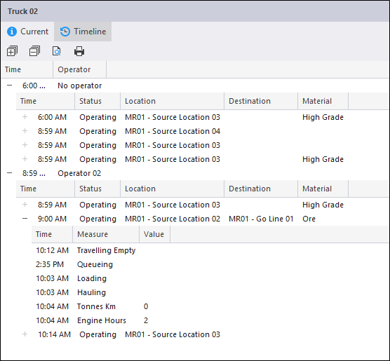 While an Equipment Timeline panel can be configured to show the cycle states recorded against hauling and loading units, more detailed information can be shown per equipment unit in the Loaders and Trucks panel.