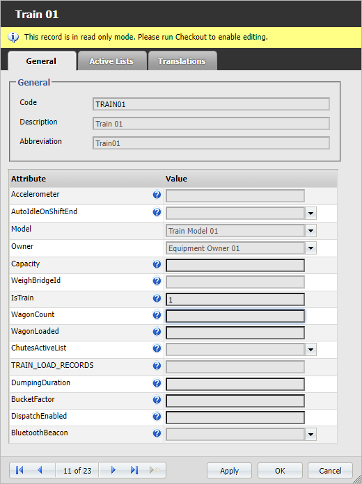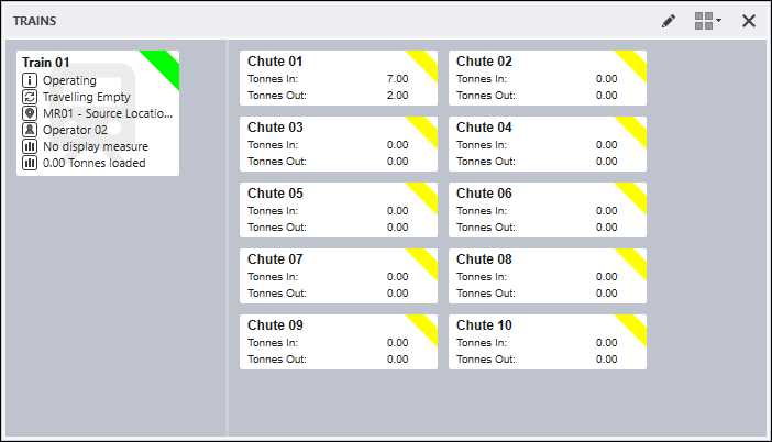 Like other equipment panels, the Train panel relies on cycle statuses. When a wagon is loaded, the cycle status is automatically changed to Hauling. When the wagon is dumped, the cycle status is changed to Travelling Empty. These events are triggered by waypoint events.