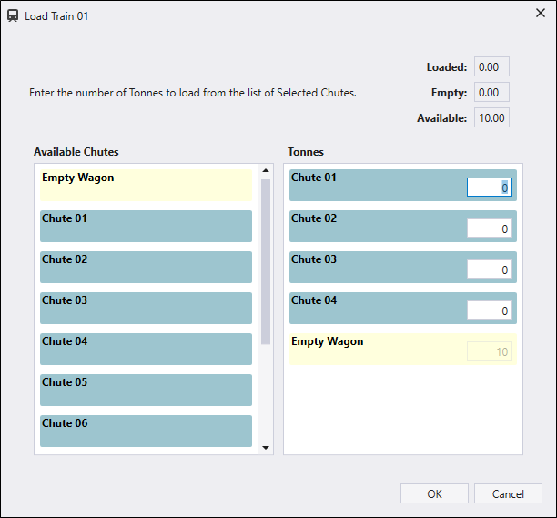 When you click on the Wagons Dumps Loaded button for a train, this opens the Load Train dialog. This dialog is used to set the number of wagons that will be loaded from one or more Chute (load) locations.