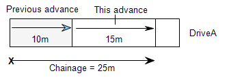 The distance along a drive from the surveyed start point to the end of the current advance.