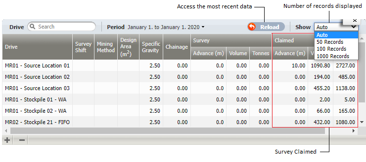 Claimed values are derived from drilling results (Metres Advanced, for example) and source-destination movements (Tonnes, for example) entered via Data Acquisition. The Survey values are check measurements made by the Surveyor.