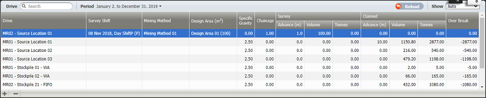 The tonnage (sum of all movements from this drive in the surveyed period) = Survey | Volume * Specific Gravity. In Configuration, if Survey Tonnes is Read Only is set, this value cannot be edited. |