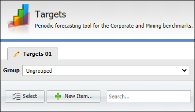 A Target Item is a metric you want to track, i.e. Tonnes Km Per Hour, Production Drill Metres, Litres Fuel, etc. To create a target item, click the New Item icon on the task bar: