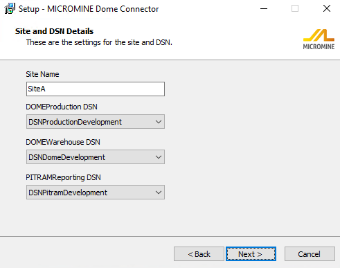 On the Site and DSN Details page, a Site name and DSN names for the DOMEWarehouse, DOMEProduction and PITRAMReporting databases, can be defined: