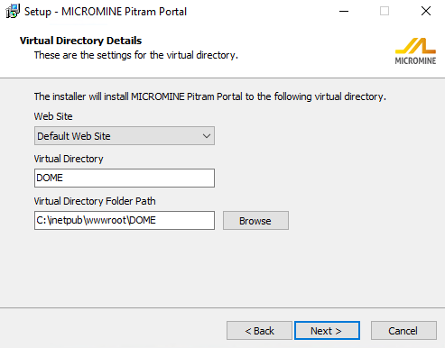 On the Virtual Directory Details wizard page, a Web Site, Virtual Directory and Virtual Directory Folder Path for the Pitram Portal, can all be selected: