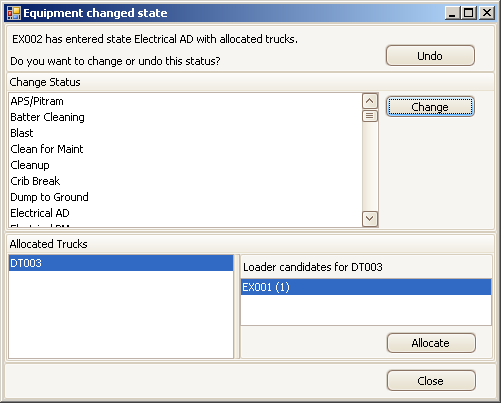 Loader Down dialog. This dialog (also available via the Tools | Display Equipment Change Dialog menu option) allows the dispatcher to change or undo the selected state as well as deal with trucks on route to the loader. If multiple loaders are available for the truck selected then the dispatch scores are shown in brackets.