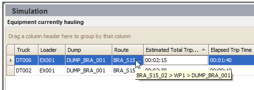In the Truck Trip panel, you can see which trucks are currently hauling to which loaders, the routes they are taking, the estimated total trip time and the elapsed trip time.
