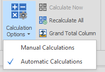 With the Calculation Option set to Manual, clicking Calculate Now will perform the same calculations that would happen on every change under Automatic mode. Recalculate All forces every Field to be recalculated whether or not the application has detected changes to the Table.