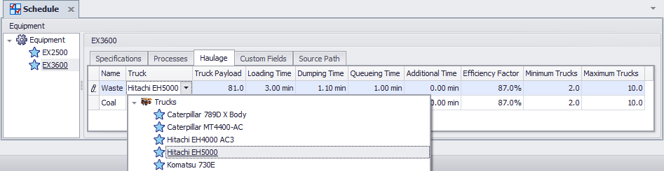 Apply Haulage simulation to equipment and set a Truck fleet to each Equipment/Process combination.