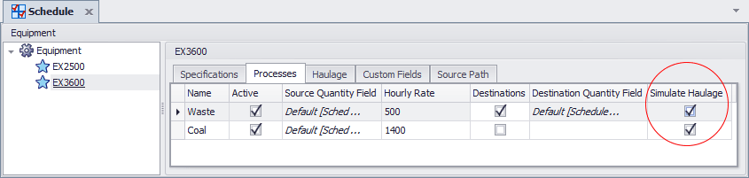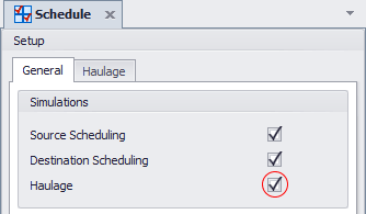 To start simulating haulage, first select the Haulage check box option in the Schedule Settings: